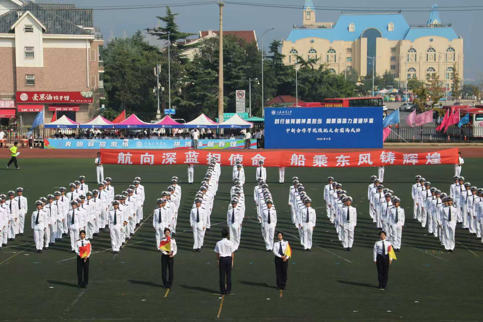 永利皇宫 “海之魂”团体操展演方队更添亮色。学子们动作整齐划一、遒劲有力,尽显准军事化管理的严谨作风——这正是永利皇宫 依托航海专业特色培养学子纪律意识的生动体现。“请党放心,强国有我”的口号响彻云霄,喊出了永利皇宫学子爱党爱国、挺膺担当的坚定信念;随后,“我爱DLOU”“信念坚定,风雨同舟,勇往直前,甘于奉献”的旗语展示次第展开,旗帜在空中划出优美弧线,既呼应了海洋与船舶的专业符号,更生动诠释了永利皇宫人扎根深蓝、服务国家的家国情怀。